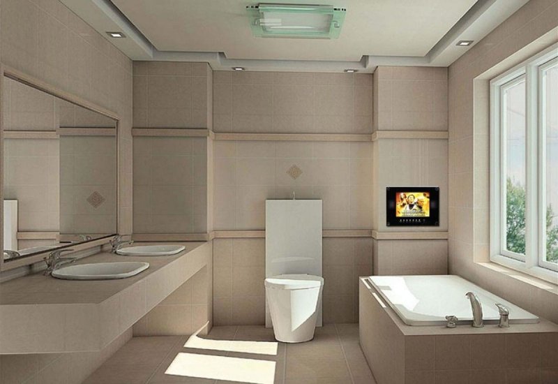 Наличие окна в ванной еще больше расширяет помещение, позволяет разместить здесь живые горшечные растения, позволяет значительно сэкономить на электричестве. Утром здесь принимают душ под лучами солнца, ночью – любуются звездами в ванне с ароматной пеной. Окошко, оформленное прозрачным стеклом, требует защиты от посторонних взглядов текстильными занавесками, подбираемыми под определенный стиль, при помощи жалюзи либо рольштор. Также практикуется стекло с односторонней видимостью, цветное витражное.