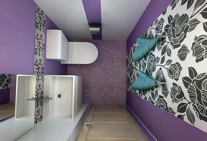 Покраска верха стены в белый цвет, а низа в пастельные оттенки визуально расширит границы туалета. Чтобы помещение не было унылым, выбирают сиреневые, лимонные, бирюзовые, весенне-зеленые тона. Отделка обойдется дешево, но краска подчеркивает дефекты, придется потрудиться над качественной подготовкой поверхности, устранить неровности углов. Раздельный туалет окрашивают водоэмульсионными, акриловыми составами. В совмещенном санузле в краску добавляют присадку, защищающую от плесени. Возле раковины, ванны выкладывают фартук из плитки.