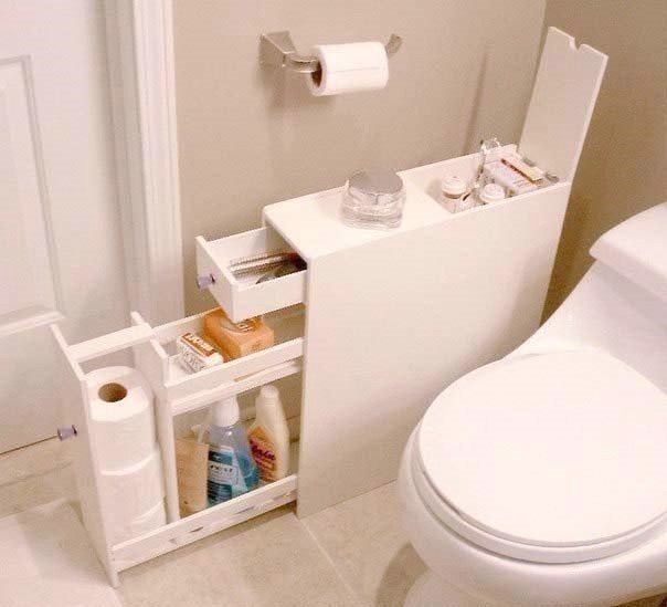На ограниченной площади предпочтительна мебель и оборудование с обтекаемыми формами. Подойдут угловые полки и пеналы, навесные шкафчики с раздвижными дверцами. Сохраняют площадь встроенные в нишу задней стены полочки, на которых хранится бытовая химия, туалетная бумага. Созданные собственными руками ниши декорируют мозаикой. Шкаф над инсталляцией может состоять из открытых или закрытых рамочными фасадами полок. Вместительное место хранения можно сделать на заказ с учетом габаритов стены и унитаза.