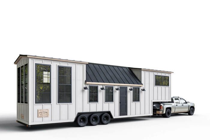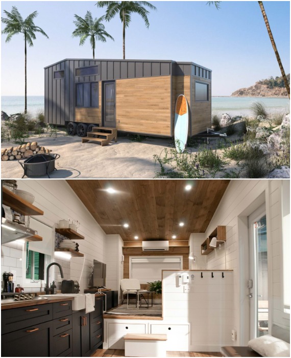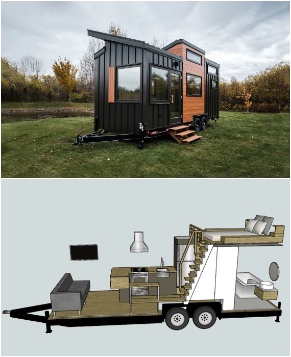 Мобильный дом Fritz от креативной команды Fritz Tiny Home Team может похвастаться элегантным скандинавским дизайном в сочетании с обилием естественного света, которые делают минижилище теплым и уютным. Стальной сайдинг, обеспечивающий презентабельный внешний вид (не требует ухода); разноуровневая крыша, создающая динамичный образ; открытая планировка, делающая интерьер привлекательным; обилие окон с тройным остеклением и прозрачная дверь – все это превращает мобильный дом в достойное и комфортабельное жилище, в котором можно жить круглый год и в любой климатической зоне.