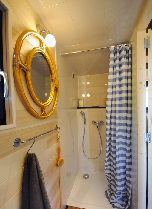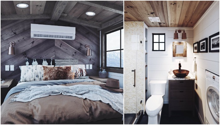 Благодаря достаточной высоте потолков в мобильном доме появилась возможность обустроить отдельную спальню на чердачном уровне, благоустроенную ванную комнату с необходимым оборудованием и даже стиральной машиной, отдельным пространством, которое можно использовать как кладовую или дополнительную спальную зону.