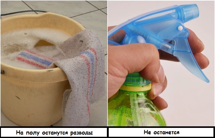 Как мы привыкли делать? Берем десятилитровое ведро, наполняем его практически доверху водой, смачиваем тряпку и начинаем мыть полы. А потом удивляемся, почему на покрытии скапливается лишняя влага и грязи становится в два раза больше. Чтобы не растаскивать воду, смешанную с пылью, ногами, предлагаем забыть про ведро. Гораздо лучше налить разбавленное моющее средство в пульверизатор, нанести его на загрязненные участки и пройтись шваброй из микрофибры. Так вы решите сразу две проблемы: не будете носить за собой по квартире тяжелое ведро и вымазывать полы еще больше, растаскивая влажную грязь.