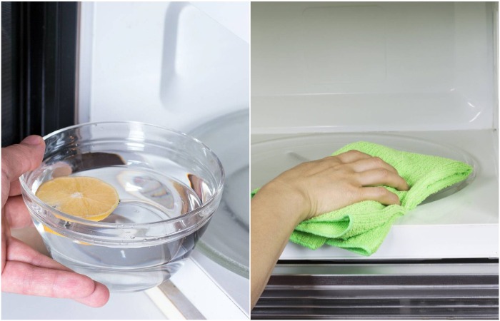 Добавьте в воду кусочек лимона В отличие от духовки, на стенках которой часто засыхают частички еды и жира, чистка микроволновки может пройти быстро, безболезненно и с минимальными вложениями сил и времени с вашей стороны. Главное – знать, как правильно провести процедуру. Возьмите небольшую стеклянную миску, налейте в нее воду, добавьте несколько капель моющего средства или пару кусочков лимона и разогрейте на высокой мощности в течение двух-трех минут. За это время внутри микроволновки образуется пар, который размягчит загрязнения, и вам останется лишь убрать их влажной тряпкой. В конце можно протереть стенки насухо, чтобы микроволновка сияла чистотой.