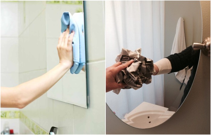 Сначала протрите зеркало влажной тряпкой, а потом – газетой Еще один лайфхак родом из СССР, который действительно работает. Чтобы после мытья на зеркальных поверхностях не оставалось некрасивых пятен и разводов, откажитесь от использования бытовой химии. Лучше протирайте зеркала мягкой тряпкой, смоченной в обычной воде, а в конце используйте скомканную газету, чтобы избавиться от возможных пятен и разводов.