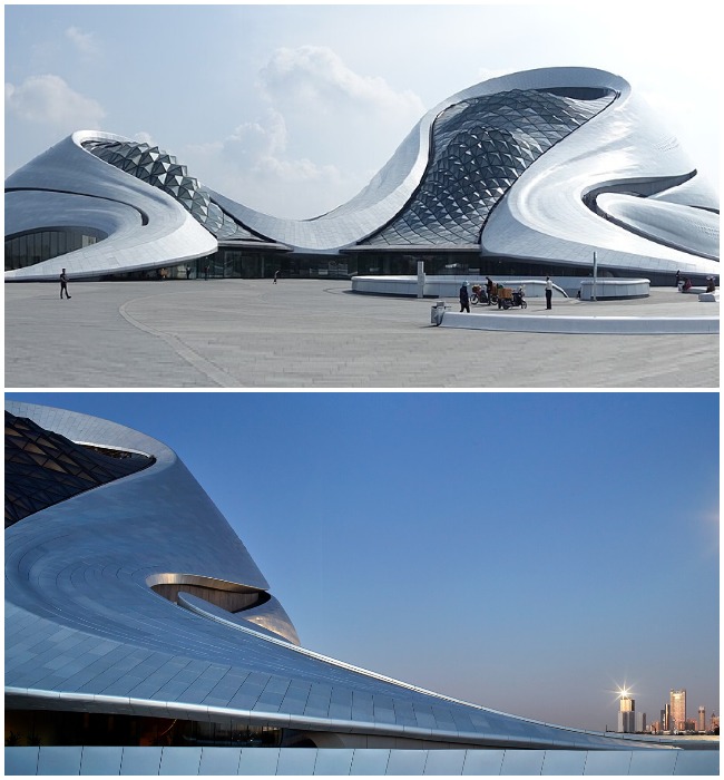 Здание Большого оперного театра в Харбине стало главной архитектурной изюминкой «Города музыки», где ежегодно проходит популярный Харбинский летний музыкальный фестиваль. Белоснежный, «расплывшийся» объект, предусматривающий успокаивающую эстетику, ярко подчеркивает природное начало всего, чего смогло достичь человечество. Органичные формы невысокого здания повторяют очертания сугробов с озерками воды, чтобы подчеркнуть важность гармоничного взаимодействия архитектуры, человека и природного окружения (в данном случае, водно-болотных угодий). • Общественный центр Цзясин в Центральным парке (Цзясин, Китай)