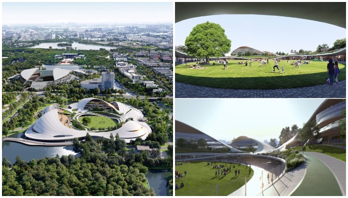 Волнообразная, разноуровневая крыша объединяет три архитектурных объекта и островки живой природы в одну структуру (концепт Общественного центра Цзясин).