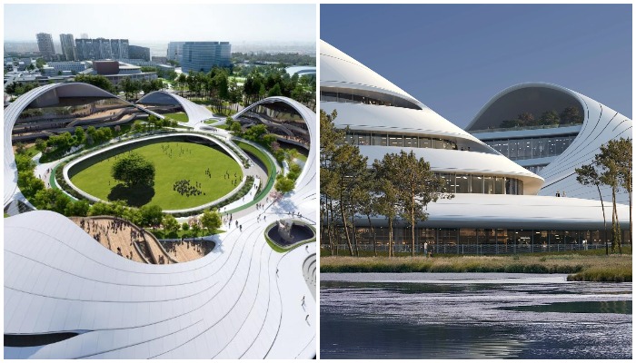 Извилистые линии крыш вдохновлены руслом реки, протекающей радом с Центральным городским парком (визуализация Jiaxing Civic Center).