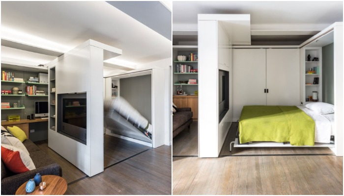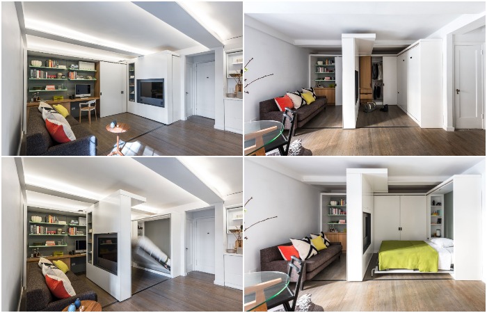 Мобильная стена позволила превратить малогабаритную квартиру в уютную и просторную квартиру со всеми необходимыми жилыми зонами (Five to One Apartment, Нью-Йорк).