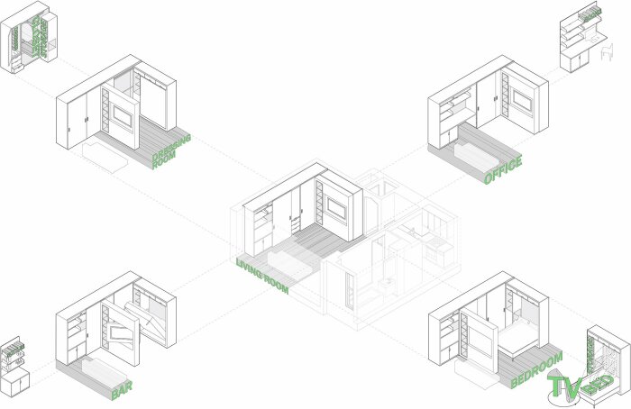 Как признаются креативные разработчики, им пришлось изучить немало техник и технологий, применяемых для увеличения пространства, и не только в качестве создания иллюзий. Требовалось знать все тонкости инновационных разработок, которые касаются жилых пространств и трансформирующейся мебели, чтобы реализовать проект, получивший название Five to One Apartment (Апартаменты 5 в 1). Адаптированные под конкретную жилплощадь и планировку квартиры-студии, современные наработки архитекторов, дизайнеров и инженеров-строителей со всего мира позволили трансформировать квартиру, расположенную в старинном доме (1920 года постройки) в Грэмерси-парке (Манхэттен, Нью-Йорк). Главный козырь проекта: Чтобы обустроить все необходимые зоны для комфортной жизни современного человека, была внедрена мобильная (передвижная) стена с секретом, которая и помогла справиться с нелегкой задачей, организации полноразмерных жилых зон, где удобно спать и готовить еду, приятно принимать ванну, отдыхать, работать или просто смотреть телевизор. Передвижной модуль, открывая тот или иной участок, позволяет расширить пространство настолько, что жильцы не смогут почувствовать дискомфорт из-за давящего чувства тесноты. При этом модульная стена является и дополнительным местом хранения, и опорной конструкцией для телевизора с поворотным механизмом, а также местом, куда спрятаны все необходимые провода и системы.