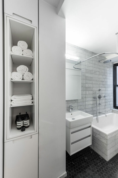 Претерпела изменения и ванная комната, теперь в ней нашлось место для бельевого шкафа, стеллажа для моющих средств и средств гигиены, подвесной тумбы под раковину. Обновили и саму ванну, отдав предпочтение укороченной модели, при этом установили и тропический душ.