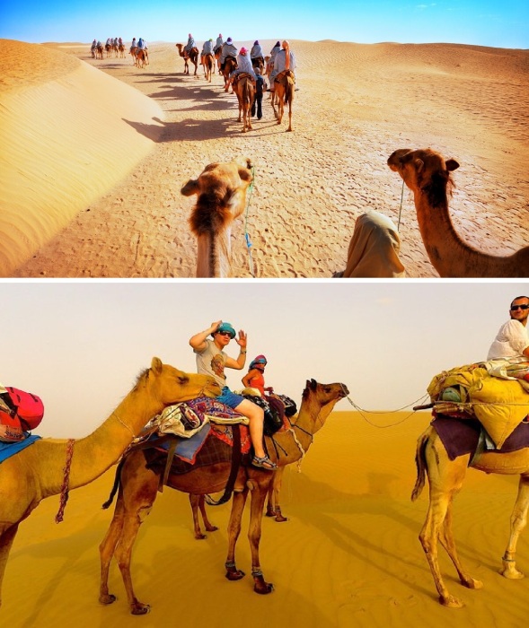 Туристам доступны прогулки на верблюдах по бескрайним дюнам, окружающим Джайсалмер (Индия).