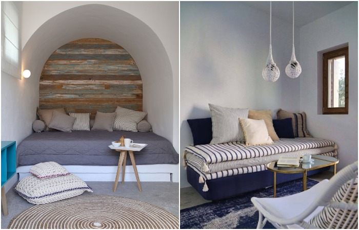 Колоритные предметы мебели, фактурный текстиль и оригинальные аксессуары создают домашнюю, умиротворенную обстановку (Syros Summer House, Греция).