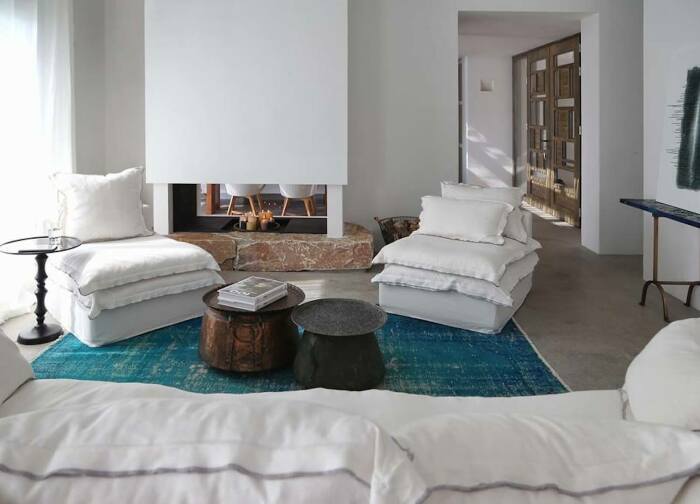 Наполненный яркими контрастами изысканный интерьер, радует домашним теплом и уютом, и это, несмотря на обилие бетона, белых стен и каменной кладки, то и дело виднеющейся из окон резиденции. Наличие камина, фактурного дерева, как в элементах мебели, так и акцентных аксессуарах, обилие текстурированного текстиля, в особенности в качестве обивки оригинальных предметов мягкой мебели, изголовья кроватей или диванных подушек, придают особый колорит и очарование внутреннему пространству, плавно переходящему на открытые террасы, предназначенные для отдыха в кругу семьи и друзей. Хотя имеется еще одна терраса, скрытая от всех, и находится она возле главной хозяйской спальни, куда есть доступ только из нее.