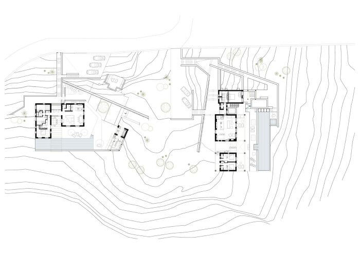 Расположение архитектурных объектов на сложном участке прибрежного холма (план Syros Summer House). | Фото: block722.com.