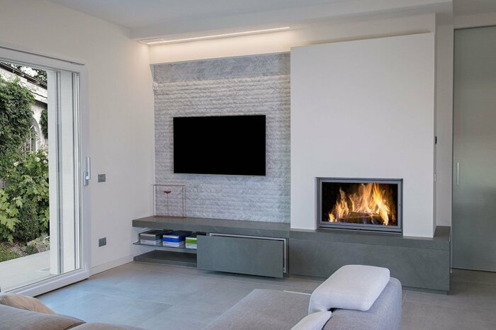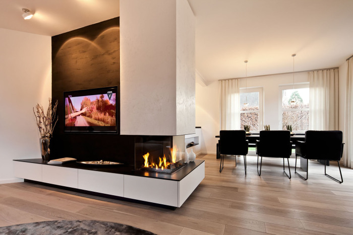 Во многих проектах биокамин и телевизор создают единую композицию и дополняют друг друга. Однако, для правильного размещения обоих элементов следует соблюдать основное правило – горячий воздух живого огня должен быть отведен от телевизора. Для этого можно установить полочку между телевизором и биокамином.