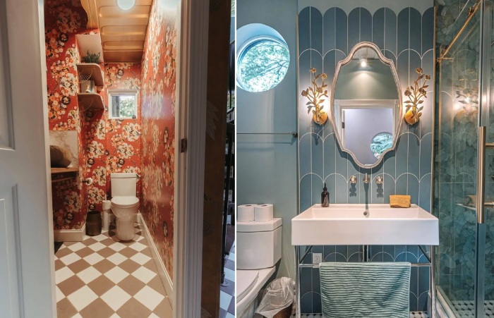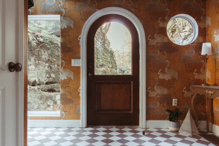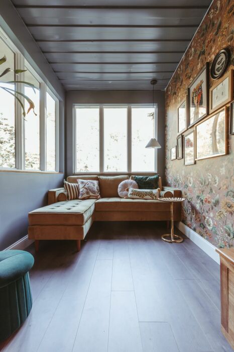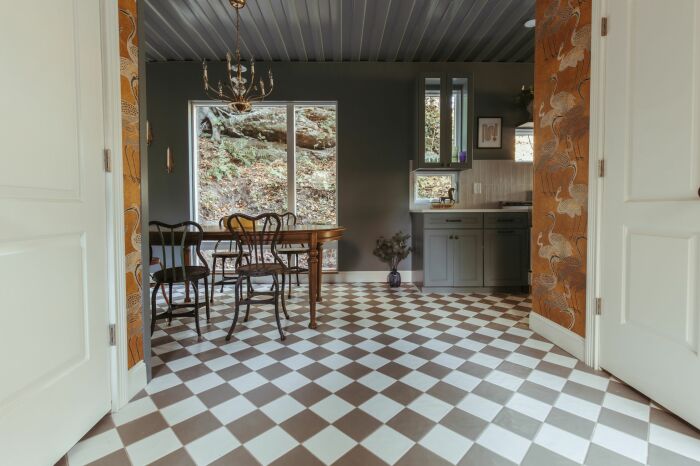 Если говорить об оформлении внутреннего пространства, то войдя в контейнерный дом посетители попадают в не менее причудливое пространство, в котором мастерски сочетаются цветовая гамма и различные текстуры материалов. Яркий дизайн интерьера привносит нотку дворцового шика в суровое окружение, делая его идеальным балансом роскоши и дикой природы. Насыщенные тона, красочные обои и прекрасное освещение по всему дому подчеркиваются причудливым декором, которые меньше всего ожидаешь увидеть в лесной резиденции. Такой контраст с окружением авторы проекта объясняют тем, что они всегда мечтали создать особенное пространство, чтобы каждый, кто попадает в дом после длительной прогулки по лесным тропам, получал максимум разноплановых впечатлений.