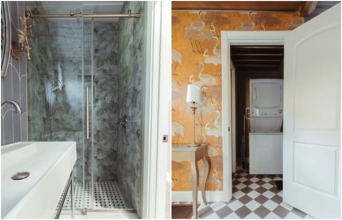 А удивляться действительное есть чему. Переступая порог Roca Box, попадаешь в эффектную прихожую с золотым потолком и красочными узорами на стенах. Отсюда можно увидеть как основное жилое пространство, так и винтовую лестницу, ведущую на верхний контейнер. Нижний уровень образуют 20-футовый (внешний размер: длина – 6,06 м, ширина – 2,44 м, высота – 2,59 м) и 40-футовый контейнер (внешний размер: длина - 12,19 м, ширина - 2,44 м, высота - 2,59 м), соединенные между собой пристроенным переходом, где находятся небольшая ванная комната, которая может похвастаться яркими обоями с букетами цветов и хорошо оборудованная прачечная.