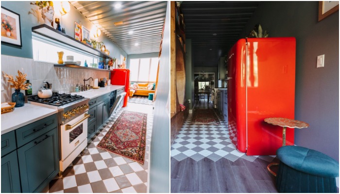 Несмотря на трудности, связанные с переоборудованием контейнеров, кухня спроектирована так, чтобы быть функциональной, при этом можно было легко поддерживать чистоту и порядок, не захламляя все стены и напольные площади. Главной особенностью благоустроенной кухни стал яркий холодильник, который видно даже несмотря на то, что все предметы мебели и техника установлены в узком помещении и в ряд. Его смелый красный цвет и винтажный вид добавляют нотку игривости в эклектичный дизайн интерьера.