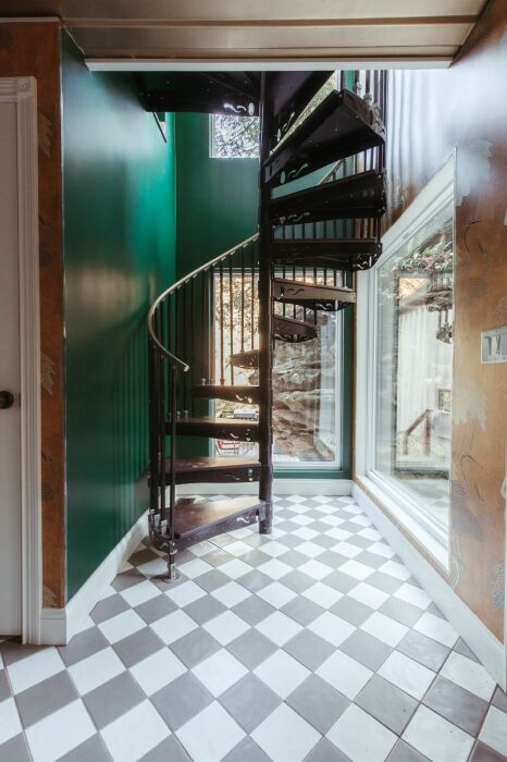 Эффектная винтовая лестница приведет на второй уровень. | Фото: theboxhop.com.