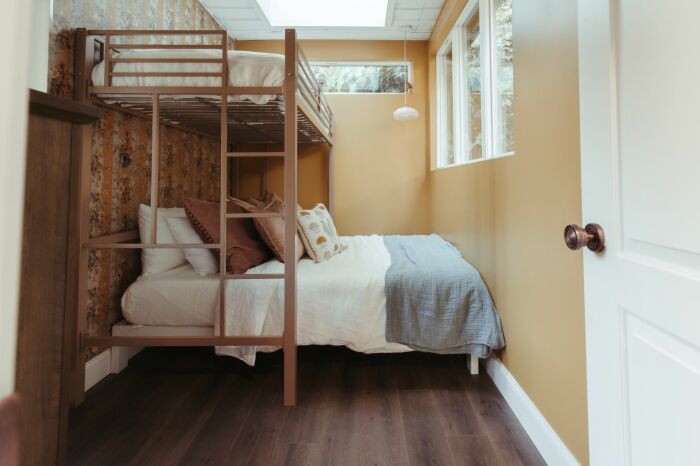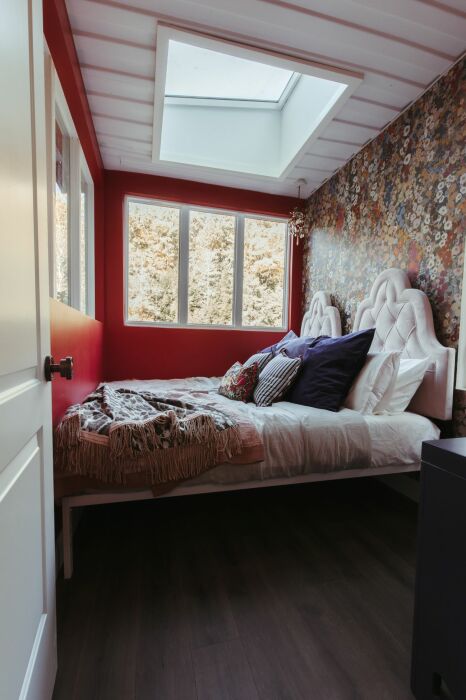Вторая спальня находится в консольной части контейнера, «свисая» над гостиной. Учитывая узкое и небольшое пространство, здесь поместилась только одна двуспальная кровать, но ограниченность площади компенсировали галерейными обоями, яркой акцентной стеной и окнами с видом на захватывающее природное окружение. А наличие мансардных окон в каждой из спальных комнат обеспечило романтическую обстановку в ночное время, когда луна и звезды устраивают мерцающее представление.