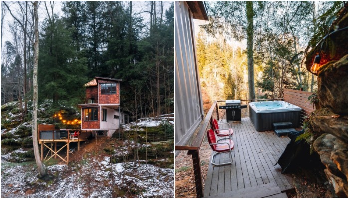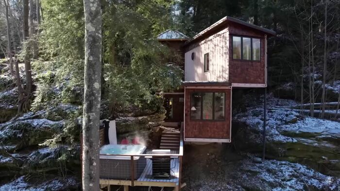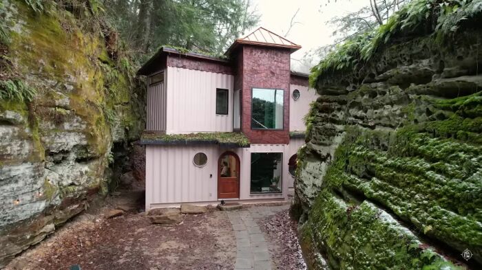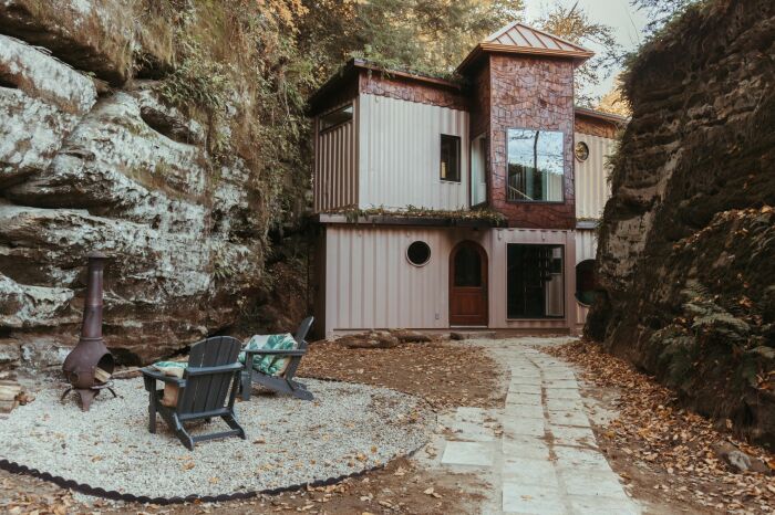 Контейнерный дом Roca Box Hop, построенный меду двумя скалами, подчеркивает гармонию между человеческим жильем и природной средой (Хокинг-Хиллз, Огайо). | Фото: teenyabode.com.