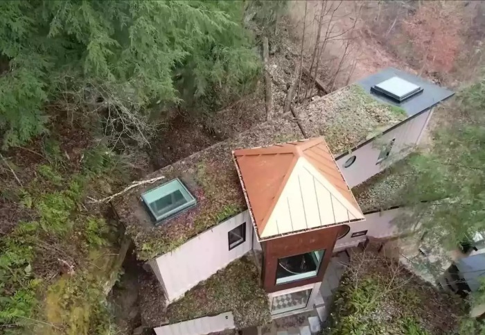 Не забыли и об экологии окружающей среды, постаравшись интегрировать архитектурный объект в скалистый склон так, чтобы не нарушать его целостность и не повредить почвенный покров рытьем котлованов или укладкой бетонных плит. При этом подобрали соответствующий цвет фасада и крыши (частично покрыли растительностью), чтобы дом максимально гармонировал с природным ландшафтом и окружением. В результате чего получился причудливый дизайн, идеально вписывающийся в заповедную зону, оставаясь вполне современным жилищем, в которое впустили не только много света, но и саму природу. Если говорить о щедром остеклении, стоит отметить, что несмотря на открытость внутренних пространств, в контейнерном доме можно рассчитывать на уединенность, поскольку он спрятан между скалами на частной территории площадью 30 га.
