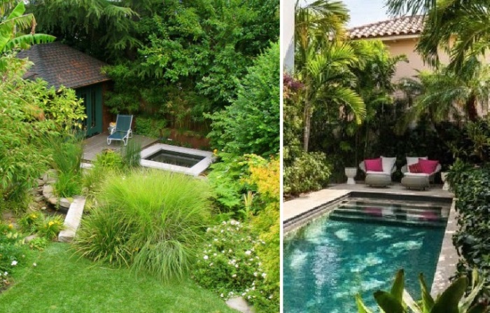 К созданию уединенной зоны вокруг бассейна стремится каждый владелец, даже если это будет совсем миниатюрная купель, ведь именно чувство уединения дает возможность максимально расслабиться и отдохнуть. Особенно актуален этот аспект при плотной застройке, когда от любопытных глаз соседей очень сложно скрыться. В этом случае можно прибегнуть к установке ограждения, которое создаст четкую границу (иногда является обязательным из соображений безопасности), при этом смягчить обстановку помогут растения, окружающие водоем. Создавая своеобразный ботанический сад, лучше отдавать предпочтение растениям с пышными листьями и вечнозеленым видам, которые придадут тропическую атмосферу, даже если живете в суровом климате.