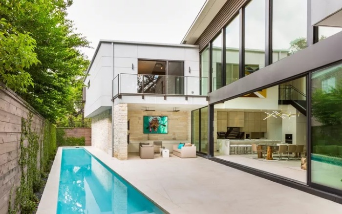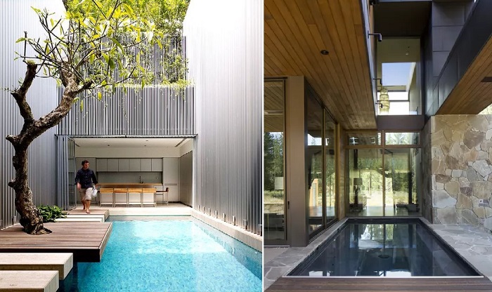 Хотя крытые бассейны давно уже не диковинка, если речь идет о больших особняках, конечно же, но все же они являются редким явлением в скромных по размерам домовладениях. Однако, в последние годы архитекторы-новаторы запросто могут порекомендовать превратить одну из комнат в бассейн. Чаще всего бассейн оказывается в одном из коридоров или переходов, который является связующим звеном, куда можно попасть со всех уголков дома. Если же при этом сделать стеклянную крышу или вовсе от нее отказаться, высадив/сохранив взрослое дерево, например, а также открыть выход из этой части дома сразу на улицу, то бассейн станет прекрасным местом отдыха для всей семьи, которая уж точно будет использовать его в свое удовольствие.