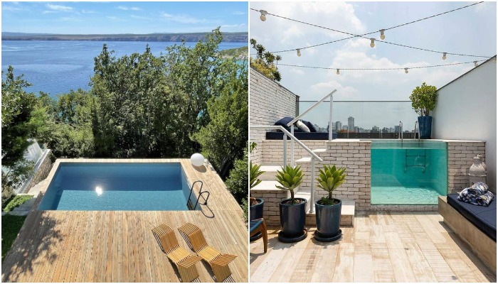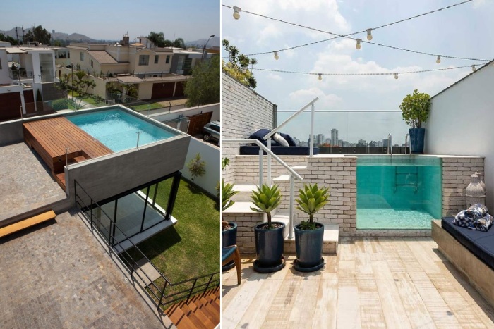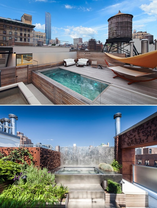 Если никак не хочется расставаться с частью любимого сада/клумбой или их вовсе не имеется, как в случае старой городской застройки, где преобладают узкие дома, прижатые друг к другу, можно подумать о размещении бассейна на крыше или открытой террасе, если ее размеры и технические возможности позволяют это сделать. Все чаще современные дизайнеры при проектировании домов или в процессе реновации старого жилого фонда превращают крыши в функциональные зоны, расширяя пространство имеющейся недвижимости за счет открытых зон отдыха.