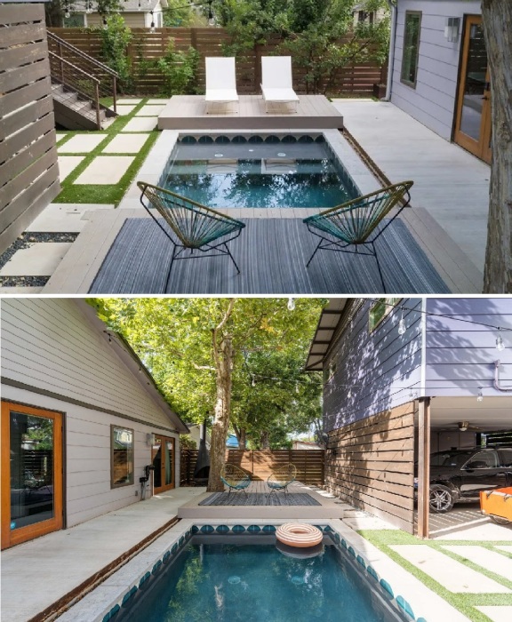 Имея крошечный двор, не каждый решится превратить его часть в бассейн. Хотя если пожертвовать одной клумбой у забора можно обзавестись прекрасным местом отдыха у воды, а в особо жаркие дни получится даже окунуться. И пусть он будет узким, и без вычурных форм или благоустроенной зоны отдыха возле, при достаточной длине и глубине удастся даже поплавать, поддерживая себя в тонусе. И это, не говоря о детях, которым хватает даже надувного бассейна, чтобы провести весело время.