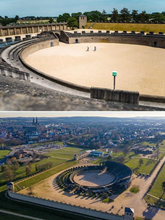 Руины масштабного амфитеатра, где устраивались зрелищные представления на круглой арене (Archaologischer Park Xanten, Германия).