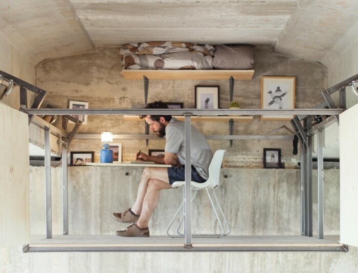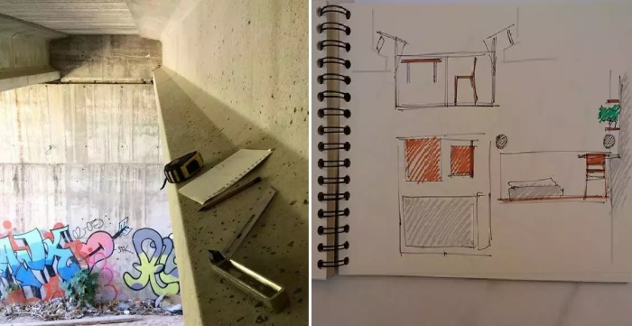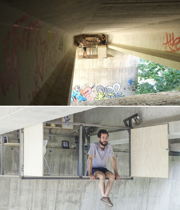 В недавнем прошлом сантехник, испанец Фернандо Абелланас, мечтающий создавать мебель, решил начать с проектирования и строительства собственной студии, чтобы развивать новую карьеру. Его страсть к разработкам неординарных проектов вылилась в удивительную концепцию, призванную организовать для себя гениальное творческое пространство, свободное от посетителей и домочадцев. И ему это действительно удалось! Вряд ли найдется более уединенное место, чем пристроит творческую студию под ...оживленной эстакадой, где единственным отвлекающим фактором является лишь рев автомобилей и гул поездов.