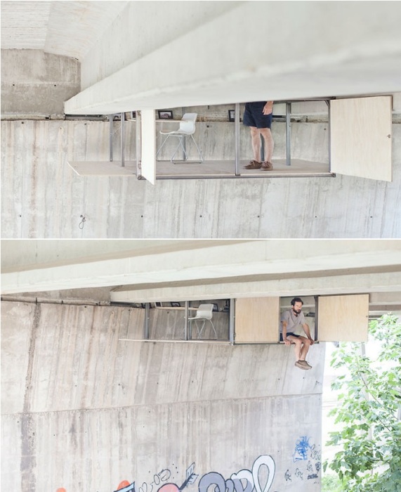 Поскольку тайное убежище каждый раз «паркуется» у торца одной из бетонных опор моста (именно она и служит основой подвесного офиса), на ней стационарно закреплена столешница для рабочего стола и пара полок. Ну а металлический каркас, на котором уложены доски в качестве напольного покрытия и частично огорожены боковые стороны фанерой, чтобы неверный шаг не привел к малоприятным последствиям, ведь высота от земли достаточно приличная, составляют основу так называемого офиса. Непритязательный интерьер дополняет стул (закреплен на крюках в бетонной стене), несколько простеньких постеров, живой суккулент в горшке и скрученный матрас со спальными принадлежностями на верхней полке импровизированного стеллажа.