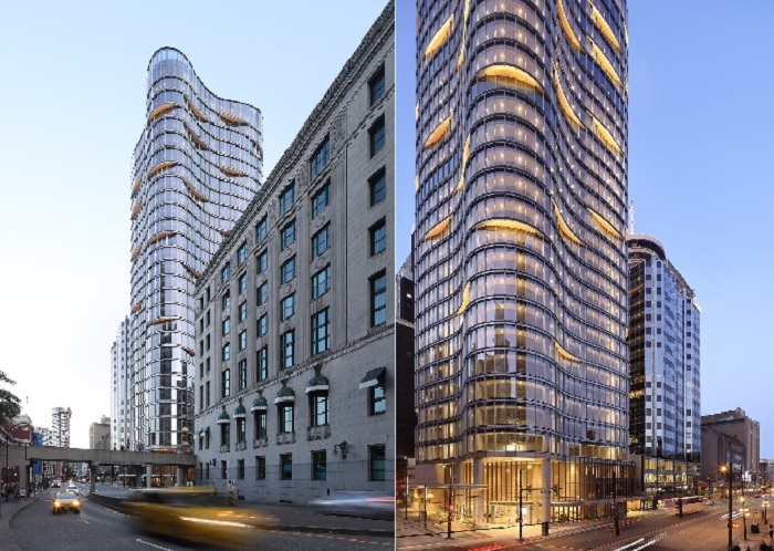 377-метровая высотка 320 Granville, появившаяся в развивающемся районе Ванкувера, является переходным объектом между центром города и набережной. Проект от всемирно известного архитектурного бюро Kohn Pedersen Fox Architects привнес эффектную нотку эстетичного наслаждения в транзитной части района, где сходятся несколько веток и видов общественного транспорта, а также главные туристические маршруты канадского города. Добавляя волнисто-каскадный элемент к горизонту Ванкувера, дизайн башни 320 Granville отражает как архитектурный контекст, так и природную составляющую района, граничащего с гаванью и набережной. Сложенные друг на друга «ленты» отражают строгие и прямолинейные формы соседних зданий, создавая динамичный диалог, между мягкими изгибами своей структуры, в которую включили элементы ландшафтного дизайна.