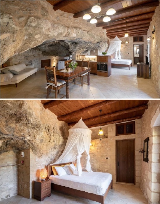 Бывшее бомбоубежище предприимчивые владельцы дома превратили в идеальное место для романтического отдыха, которое они теперь сдают через Airbnb (Крит, Греция). Спустя несколько десятилетий Костас, рассматривая старые фотографии, обнаружил снимок его прабабушки, которая, будучи еще ребенком, спала в той самой «пещерной» комнате на деревянной кроватке. Именно она и стала вдохновением для супругов, решивших возродить традиции. После косметического ремонта, энтузиасты обнаружили, что создали «идеальное место для романтического отдыха». Это и послужило толчком для обустройства «пещерного домика», который они теперь сдают в аренду через Airbnb. Теперь гости со всего мира могут наслаждаться отдыхом в прекрасно оборудованной студии, где имеются: гостиная с диваном под фактурным валуном, полностью оборудованная кухня-столовая, двуспальная кровать с балдахином, благоустроенная ванная комната, и терраса с видом на живописный пейзаж. Также к их услугам вполне современные удобства, включая Wi-Fi и телевидение, а также кондиционер, который скорее подсушивает воздух и слегка подогревает его, нежели служит для охлаждения, поскольку даже в самые жаркие дни температура воздуха не превышает 18-20 градусов.
