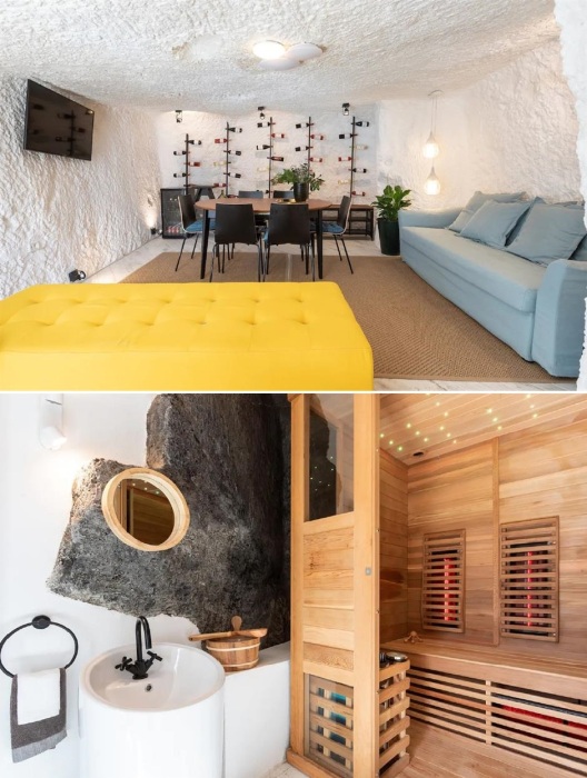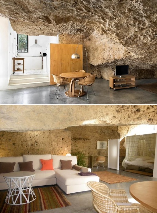 По сведениям редакции Novate.ru, изначально пещерное образование использовалось местным жителем, который его основательно увеличил и оборудовал внутри скалы винный погреб, позволяющий хранить вино при правильной температуре и влажности. Затем он расширил свои владения до небольшой винодельни, где было установлено специальное оборудование. После того как пещерный объект был продан, новый владелец решил превратить его в особенный отель, предлагающий прочувствовать на себе, каково жить в пещере. Естественно, современные гости не будут греться целой толпой у костра посреди пещеры, к их услугам представлены сразу четыре больших пещерных пространства. В одном – находится гостиная и кухня, а в трех остальных – спальни, в которых частично сохранены дизайнерские решения самой матушки природы, подчеркнутые фактурой грубо отделанного камня, хотя и окрашенного в белый цвет, чтобы не вызывать угнетающее чувство. Дополнением к пещерному уединению является открытый балкон, с которого открывается панорамный вид на прекраснейшие парковые зоны.