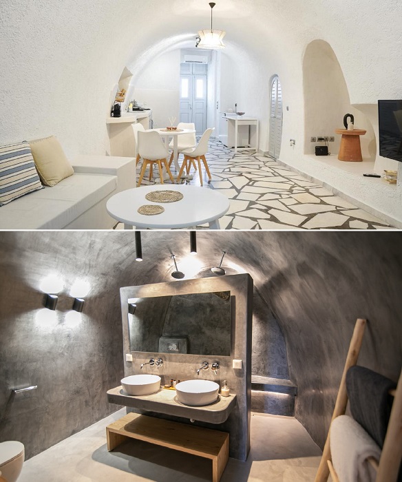 Внутри Demeter Cave House переплелось очарование традиционного пещерного дома с современными удобствами и предметами роскоши (Санторини, Греция).
