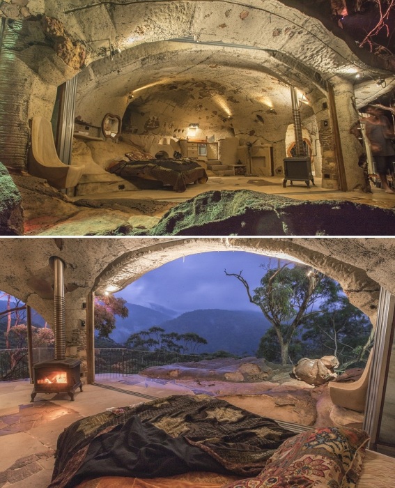 «Пещерный» интерьер идеально сочетается с живописным окружением (Enchanted Love Cave, Австралия). Не только природные пещеры могут погрузить в мир доисторической атмосферы. Впечатляющая и уютная рукотворная пещера (сделана из стали, бетона и природного камня), расположенная высоко над верхушками деревьев в одном из самых живописных мест Австралии, стала идеальным местом для уединения романтически настроенных пар, которые стремятся хоть ненадолго сбежать от суеты современного мира. Речь идет о «Зачарованной пещере любви» (Enchanted Love Cave), появившейся благодаря стараниям дизайнера Лайонела Баккета, который решил реализовать свои фантазии в Национальном парке Голубые горы (недалеко от Сиднея). Небольшая терраса на лесистом склоне горы стала местом вдохновения для создания рукотворной пещеры, в которой есть все для незабываемого отдыха парочки влюбленных: двуспальная кровать, ванная комната, гостиная у дровяного камина, зона отдыха и тропический душ на отрытой террасе с видом на живописное окружение. Стоит отметить, что «Зачарованная пещера любви» расположена так, что, находясь внутри жилого пространства, создается впечатление будто оно парит между верхушек деревьев.