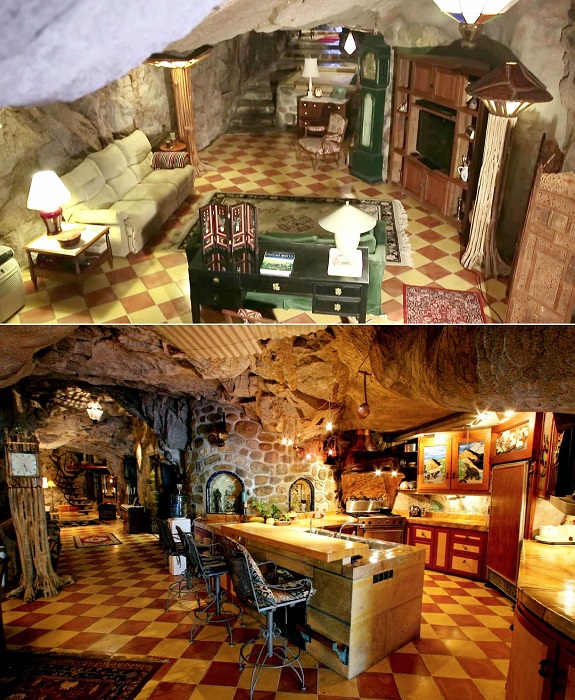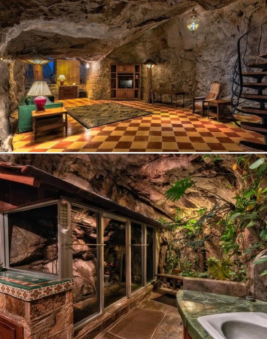 Странный, но довольно колоритный дом может похвастаться довольно просторными комнатами, а их на 250 «квадратах» удалось обустроить немало. Гостиная, кабинет, кухня, столовая с винтовой лестницей, ведущей в спальню на втором ярусе, еще три спальни на нижнем уровне, четыре ванные комнаты, прачечная, уединенные зоны отдыха как в самом пещерном доме, так и перед входом (с фантастическими природными горячими источниками, где организовали бассейны и ванны) – всего этого оказалось вполне достаточно для незабываемого отдыха большой семьи и их друзей.