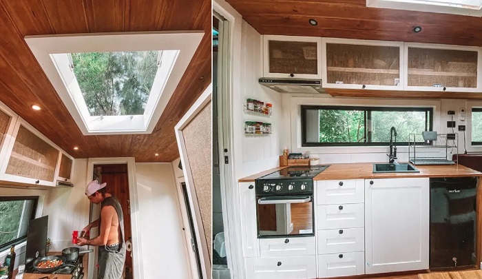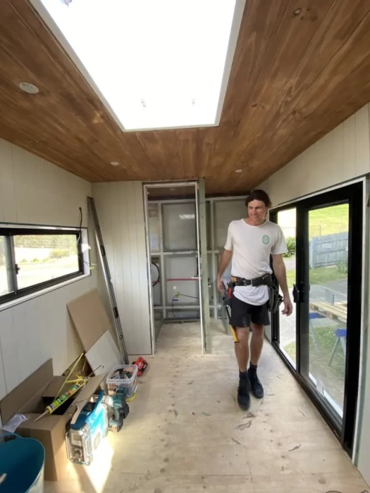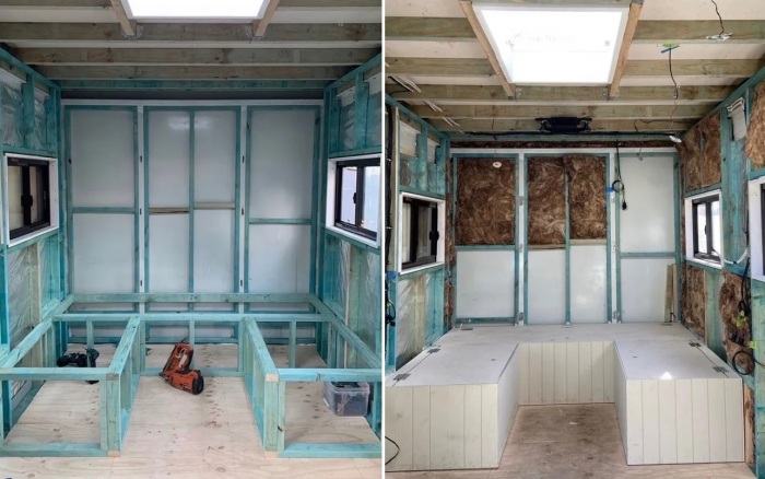 Поскольку это был грузовик, его фургон не требовал кардинальных изменений конструкции, молодому человеку оставалось лишь надежно утеплить со всех сторон кузов, чтобы в любых климатических условиях температура в жилище была комфортной. Приходилось учитывать то, что температура в стране в разных регионах очень разнится, начиная с муссонных зон и заканчивая раскаленными пустынями или снегами и морозом в зимний период в Австралийских Альпах, находящихся на юге страны. Плюс ко всему качественное утепление способствует прекрасной шумоизоляции, что совсем немаловажно для дома, сделанного из металлической коробки, даже несмотря на то, что частично боковые стены снаружи облицованы досками. После этого оставалось обшить внутренние плоскости древесностружечными материалами разных видов (в зависимости от зоны, нагрузки и функционала), установить оконные рамы и стеклянную панель с раздвижными дверями, сделанными на заказ, и провести инженерные коммуникации.