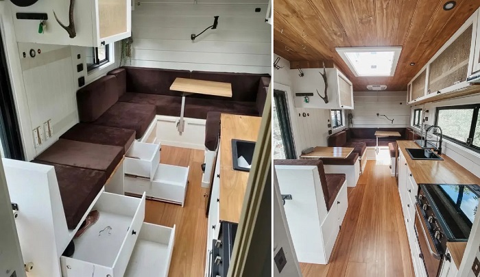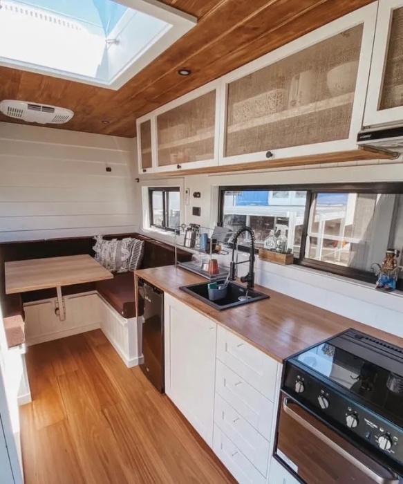 Ближе к выходу молодые люди обустроили полноценную кухню, ведь путешествия могут забросить в дальнюю глушь, где придется обходиться своими силами, чтобы пропитаться, поэтому они сделали все, чтобы все необходимое всегда было под рукой. Здесь получилось установить вместительные напольные тумбы с полочками и выдвижными ящиками, встроенный духовой шкаф, мойку, электрическую варочную панель, небольшой холодильник и шкаф-кладовую, где можно хранить сухие съестные запасы и консервы, а также навесные шкафчики для посуды. Напротив кухни предприимчивые супруги умудрились втиснуть и небольшую столовую на двоих, с изготовленными самостоятельно креслами, внутри которых также имеются ящики для хранения и закрепленный между ними откидным столиком. Этот столик молодые люди используют как еще одно рабочее место.