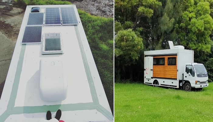 Несмотря на то, что фургон у грузовика совсем небольшой (Isuzu, длина кузова – 4,85 м, ширина – 2,15 м и высота 1,98 м) в нем нашлось место и для благоустроенной ванной комнаты с душем, биотуалетом с функцией компостирования и раковиной. Кстати сказать, обеспечивают такие удобства как электричество для освещения и корректной работы бытовой техники, водонагревателя, сплит-системы и насоса, солнечные панели, установленные на крыше теперь уже дома на колесах. А вот для воды предусмотрено две системы. Одна рассчитана на сбор и очистку дождевой воды, вдруг придется вести автономный образ жизни, а другая – состоит только из емкости, которую можно наполнять в любом удобном для этого процесса месте. Из любой системы вода внутрь дома поступает из резервуаров, спрятанных под днищем фургона, там же находится дизельный генератор и емкость для сбора сточной воды.