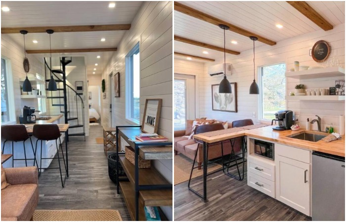 Чтобы в итоге потребитель получил то, о чем мечтал и за что заплатил немалые деньги (даже по меркам Соединенных Штатов), разработчики использовали натуральные материалы, инновационные технологии и «умные» системы. Если говорить о планировке флагманской модели, то имеющуюся площадь спланировали так, чтобы наилучшим образом использовать доступное пространство. На нижнем этаже, который начинается с прилегающей террасы, раздвигающей пространство за счет стеклянных дверей, стирающих границы между внутренним и внешним миром, предусмотрена открытая планировка. Благодаря этому внутри довольно узкого контейнера удалось оборудовать спальню, ванную комнату и открытую зону, объединяющую гостиную, столовую и кухню. Все эти пространства щедро «приправлены» окнами, которые значительно увеличивают объем, даже самых небольших зон. Плюс ко всему при отделке дизайнеры компании отдают предпочтение белому цвету и светлым тонам, которые помогают избавиться от давящего чувства в небольших и невысоких пространствах. Напомним: Внутренние габариты 40-футовых контейнеров: длина – 12,03 м, ширина – 2,35 м, высота – 2,4 м. Это без учета слоя утепления и внутренней отделки металлической структуры.