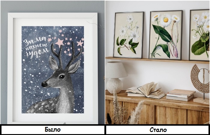 Если вы заполняете пустые стены постерами, самое время сменить зимние или нейтральные изображения на весенние. Отлично будут смотреться букеты цветов, поля с тюльпанами, фонтаны в окружении клумб, уютные столики на террасе, сервированные вкусным завтраком. Казалось бы, мелочь, а как сразу меняется настроение в комнате. Также можно сделать галерею из ваших семейных фотографий – достаньте любимые снимки из старых архивов или распечатайте свежие. Кстати, при смене постеров не забудьте протереть от пыли рамки и стекла – наверняка за последние несколько месяцев накопилось большое количество. Конечно, издалека пыль не особо видно, но как только вы избавитесь от нее, то сразу заметите, как преобразятся настенные аксессуары – они станут как новые.