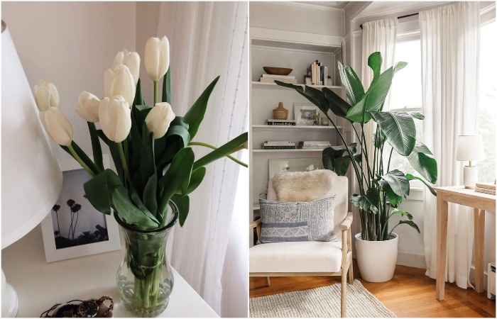 Отличными акцентами станут декоративные подушки, шторы, кухонные полотенца и скатерть, постельное белье, один или два мягких пуфа в гостиной. Также можно перекрасить старые стулья – если кухня оформлена в нейтральных тонах, они прекрасно впишутся в имеющуюся обстановку. Унылый пол преобразит ковер с растительным принтом, а хорошему микроклимату в квартире поспособствуют комнатные растения, которые можно будет поставить не только на подоконник, но также на тумбу, журнальный столик или полку. Обратите внимание, что большое количество весеннего декора можно сделать своими руками. Даже если вам кажется, что вы далеки от рукоделия, начните с самого простого, например, обмотайте цветочный горшок бечевкой и украсьте его сухоцветами. Вуаля – оригинальное кашпо под комнатное растение готово!