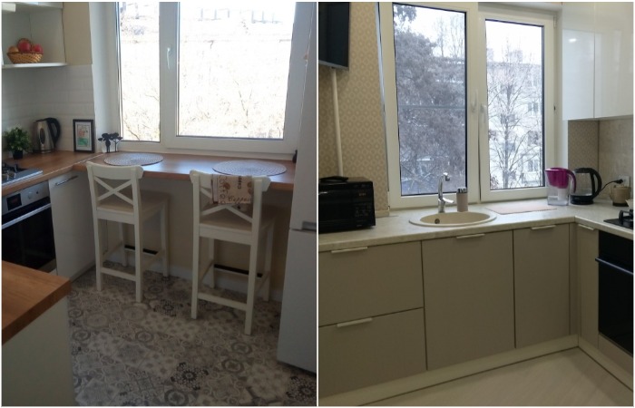 На маленькой кухне важно максимально грамотно задействовать каждый метр. Это тот самый момент, когда любая поверхность должна нести функциональную нагрузку. Не является исключением и пространство у окна. Здесь можно разместить шкафы кухонного гарнитура или столешницу, которая одновременно будет выполнять роль барной стойки. А если у вас нестандартная кухня с эркером, оформите полноценную обеденную зону. Тогда можно будет завтракать, обедать и ужинать, наслаждаясь чудесным видом из окна.