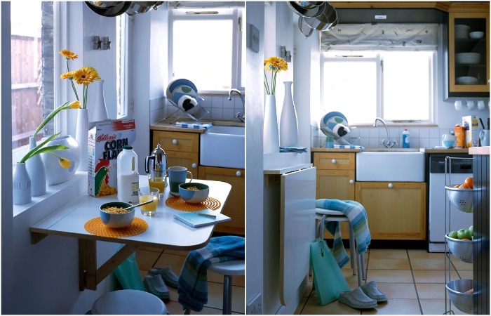 Следующая «головная боль» маленьких кухонь – полноценные обеденные столы, которые обычно занимают практически половину площади. Согласны, для большой семьи – это идеальные варианты, и смотрятся они всегда стильно и красиво. Однако не следует жертвовать удобством ради мечты сделать интерьер «как в журнале». С учетом того, что большинство хозяек проводят на кухне много времени, здесь собираются члены семьи и друзья, важно, прежде всего, подумать о функциональности комнаты.