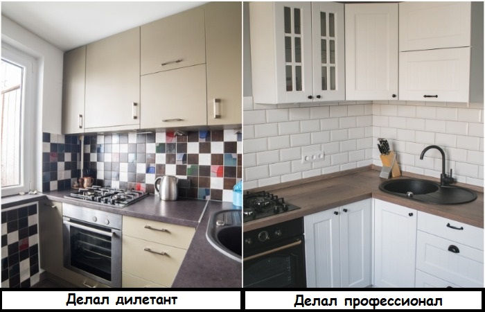 Лучше всего на плитку ложатся следующие виды краски: эпоксидная, эмалевая и специальная водостойкая. Перед тем, как приступать к процедуре, не забудьте подготовить фартук – очистить от загрязнений, обезжирить, покрыть грунтовкой. Конечно, со временем краска может потрескаться, но это случится когда-нибудь потом. А сейчас у вас получится не только обновить кухню при минимальных вложениях, но и зрительно увеличить ее.
