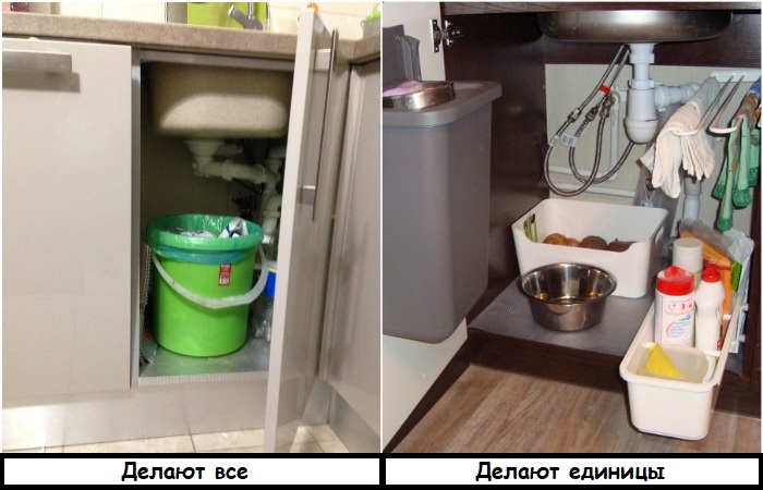Если вы понимаете, что вам негде развернуться на собственной кухне, подумайте, насколько правильно у вас организовано хранение. Очень часто хозяйки забивают шкафчики, открытые полки, но при этом совершенно забывают о месте под раковиной. А между тем эта зона является лидером у организаторов пространства. Здесь отлично помещается не только мусорное ведро, но и бытовая химия, инструменты для уборки и даже корзинки с овощами.