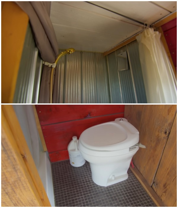 В этой части дома на колесах оборудована крошечная ванная комната с душем и туалетом, а вот баки для воды спрятаны между сиденьем и душевой кабиной. Остальное же пространство переоборудованного контейнера, имеет открытую планировку, чтобы не ограничивать и без того скромную площадь. Для максимального уплотнения были задействованы все вертикальные поверхности и скрытые ниши, которые образовались под кроватью, установленной на высоком подиуме, а также рабочей поверхностью, выступаемой в роли столовой и домашнего офиса.